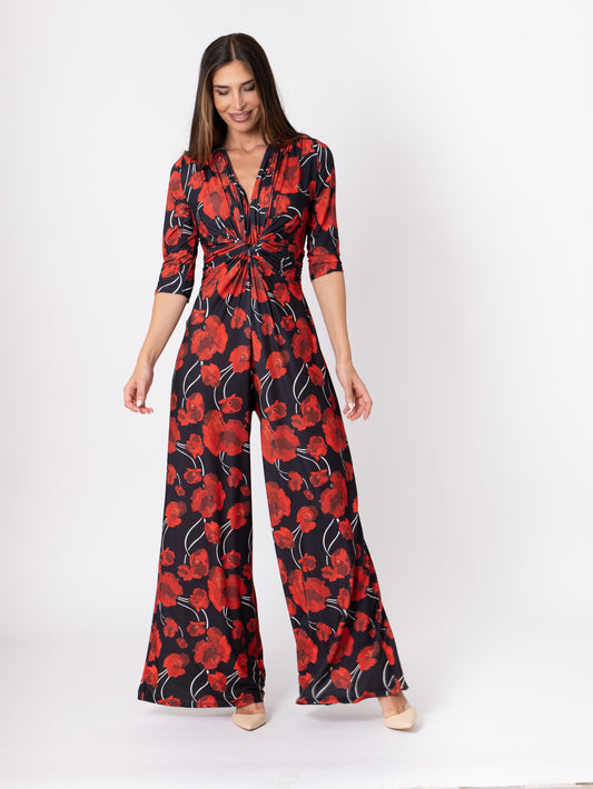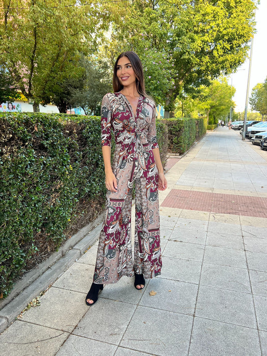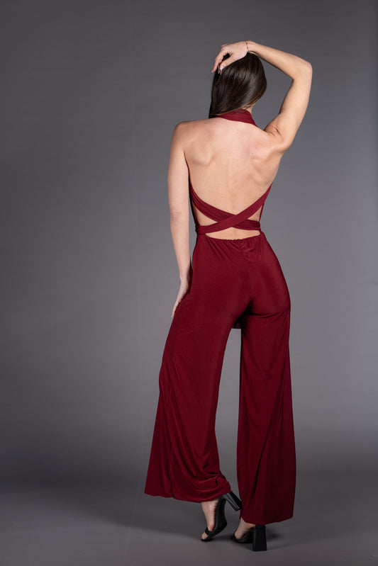 Conjunto pantalón palazzo y top con mangas de tul. Granate