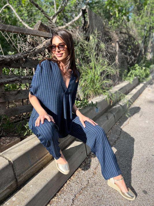 Conjunto pantalón palazzo y top con mangas de tul. azul