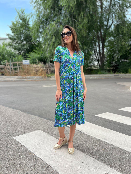 Vestido Midi escote pico estampado selva verde