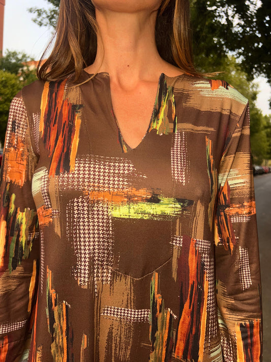 Vestido largo escote pico estampado fondo marrón