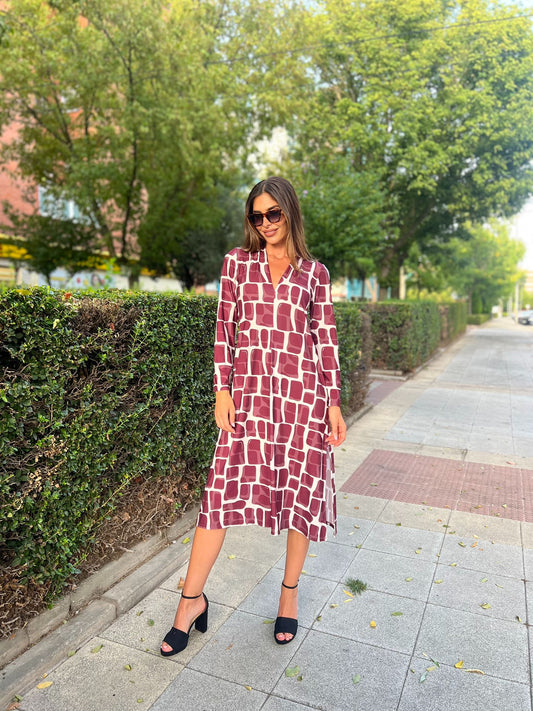 Vestido midi escote pico estampado jirafa granate