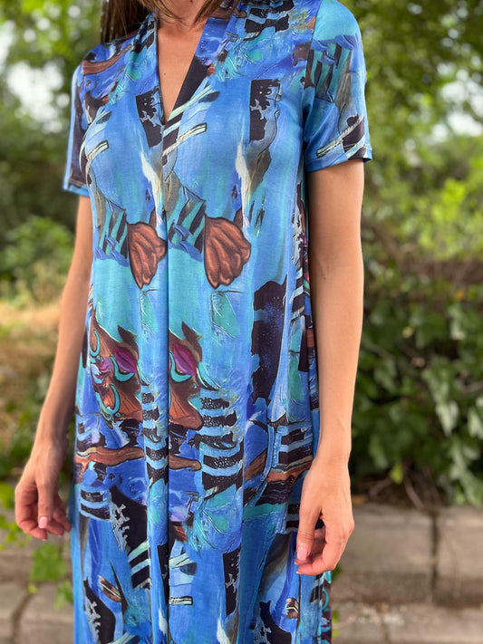 Vestido Midi escote pico estampado fondo azul/choco