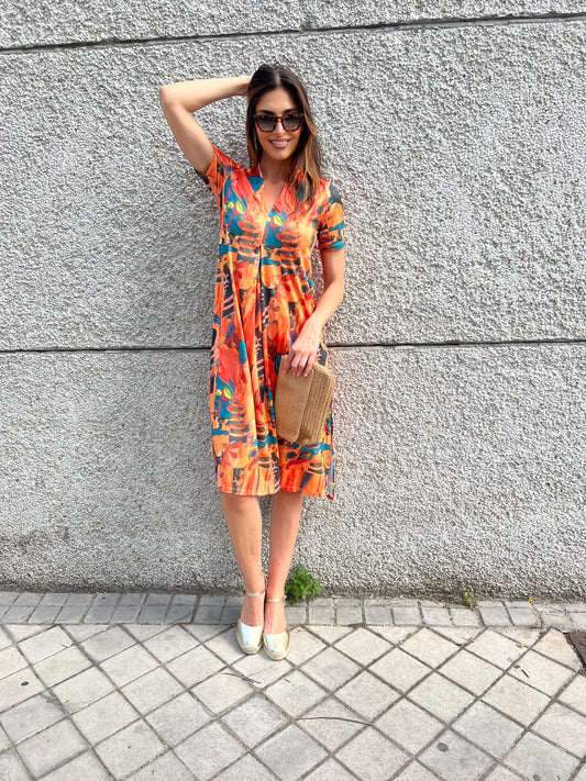 Vestido Midi escote pico estampado fondo naranja/choco