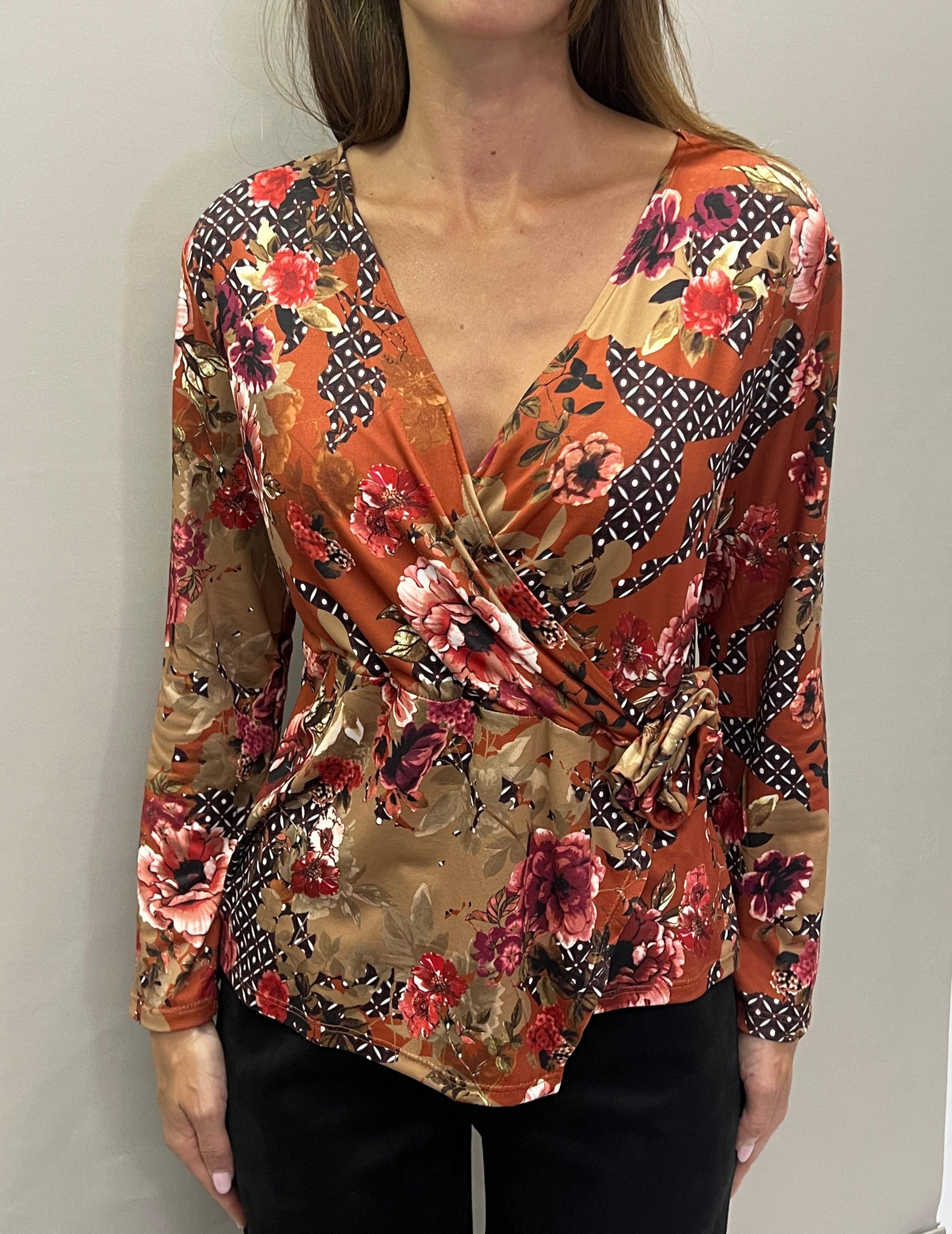 Dale un toque femenino y elegante a tu look con esta camiseta de escote cruzado y detalle de flor drapeada en el costado, que estiliza la silueta y aporta un aire sofisticado.