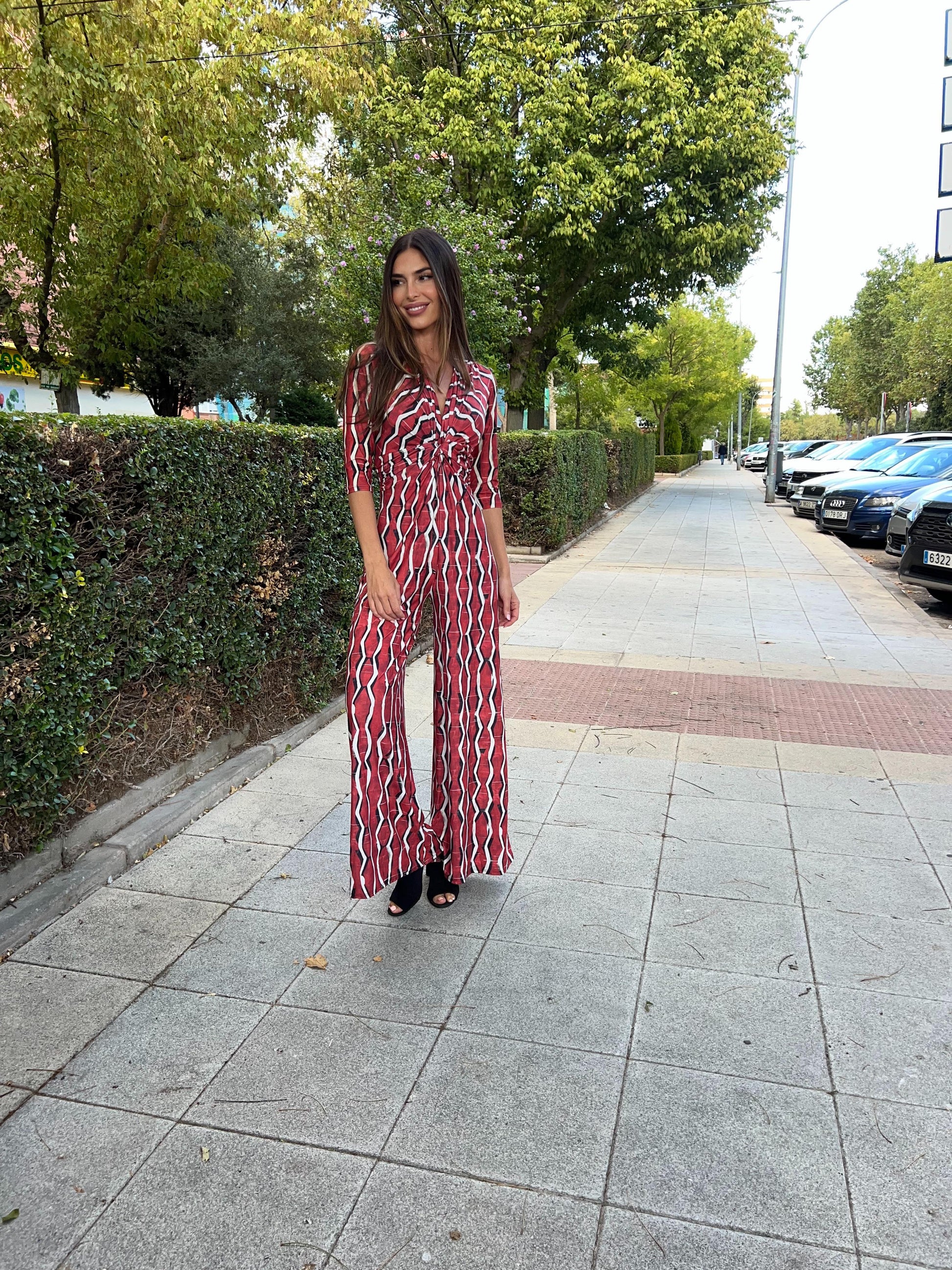 Este hermoso conjunto de ropa cuenta con un mono de escote pico y un elegante nudo debajo del pecho, que resalta la figura femenina de una manera encantadora.