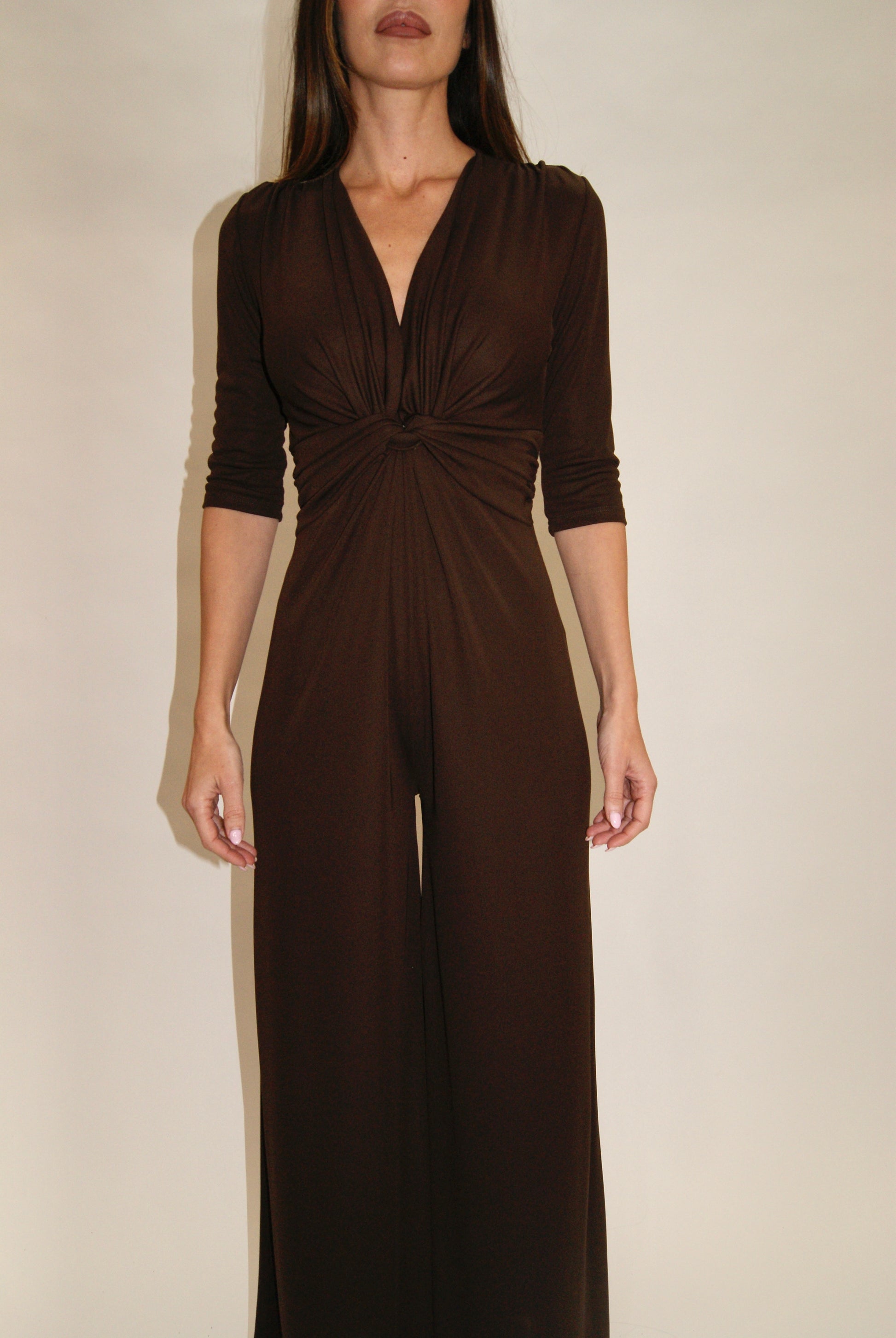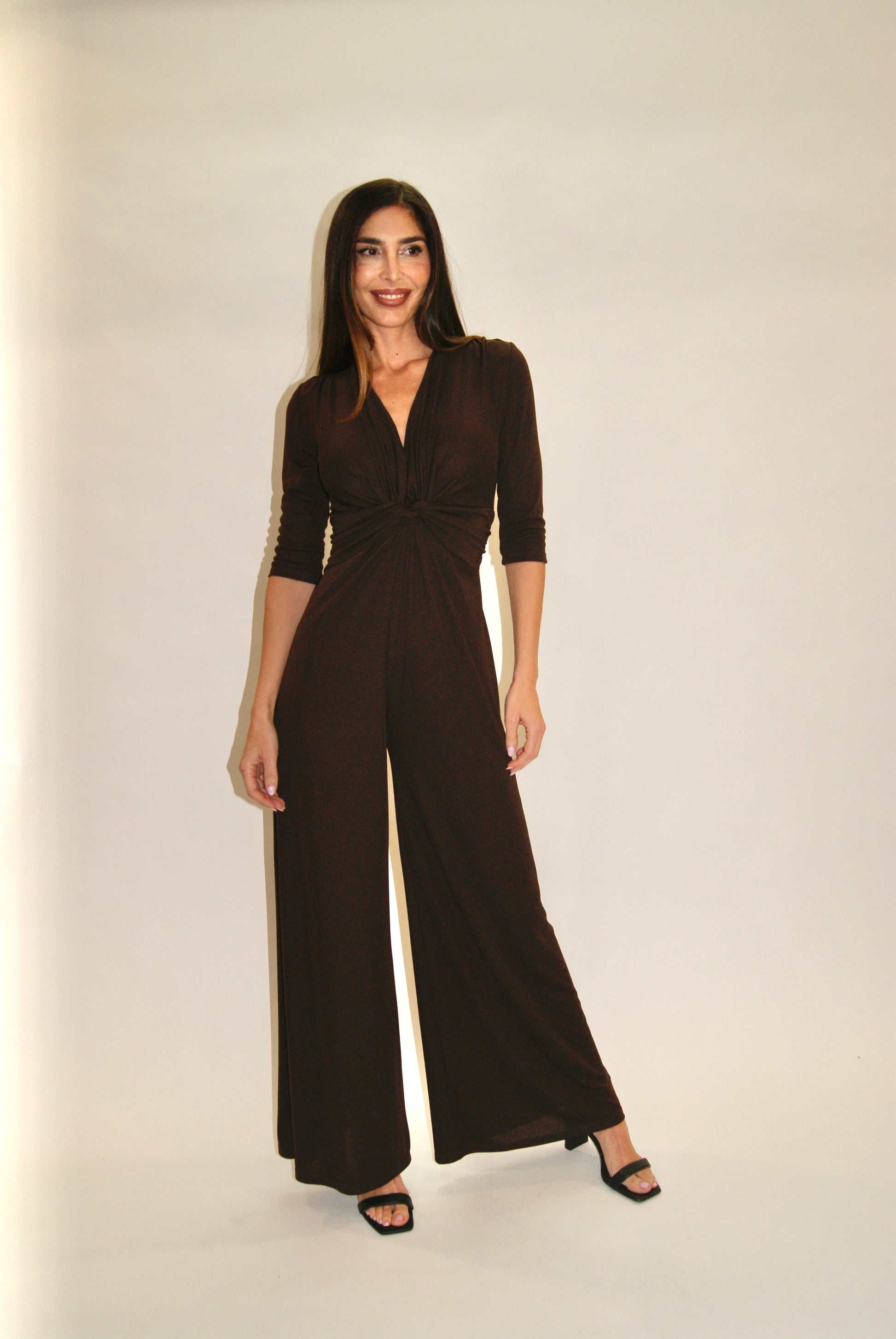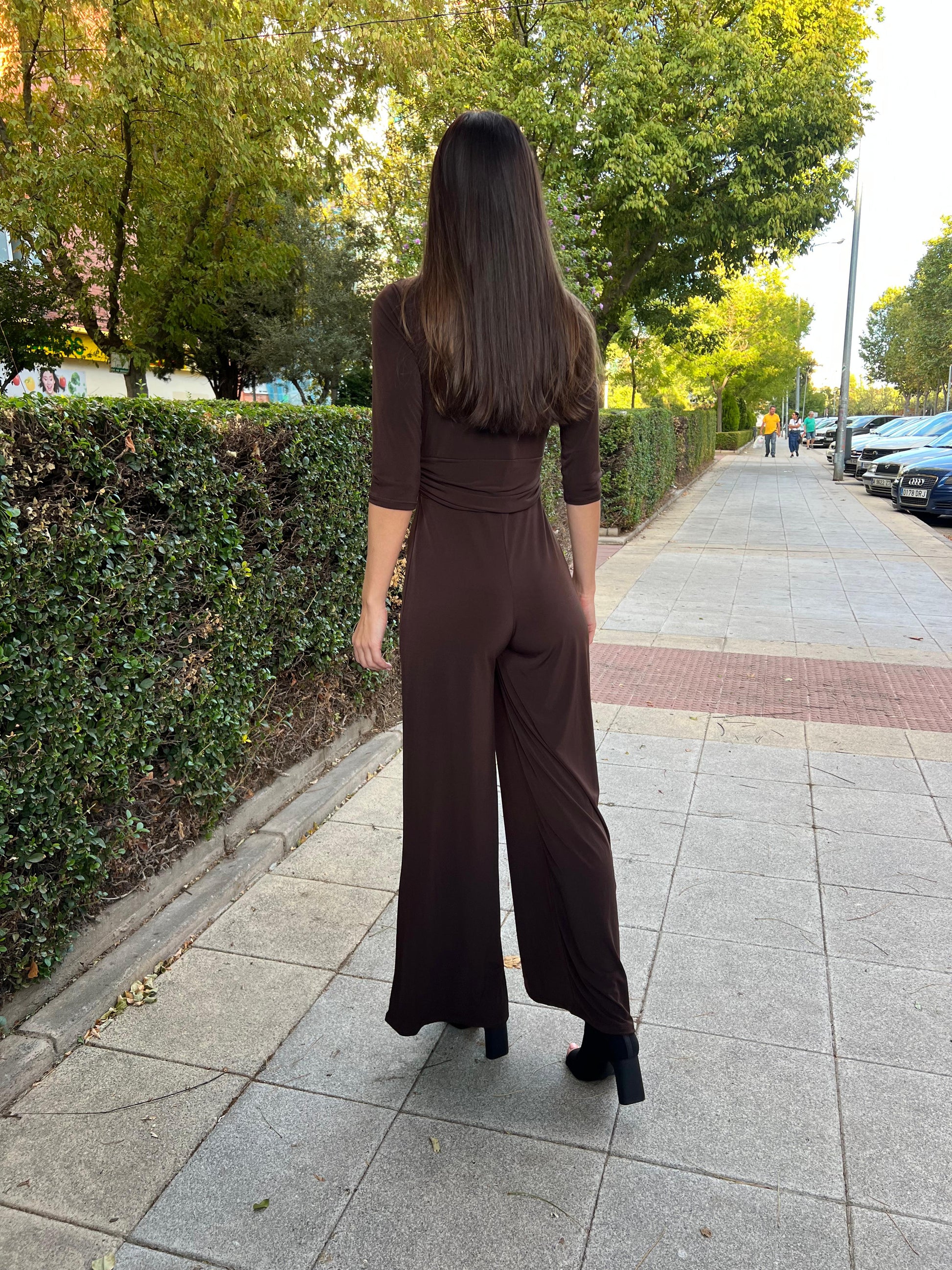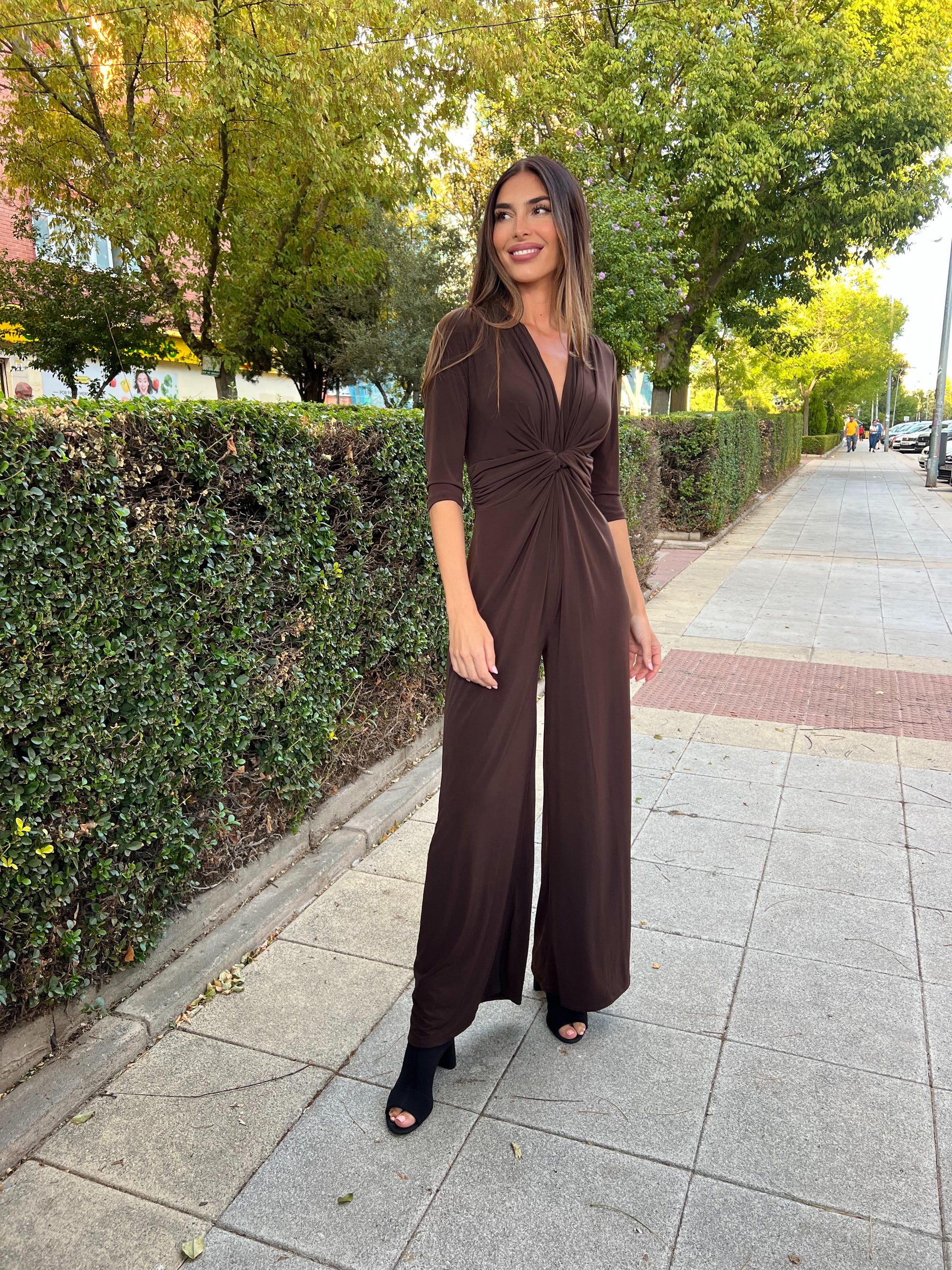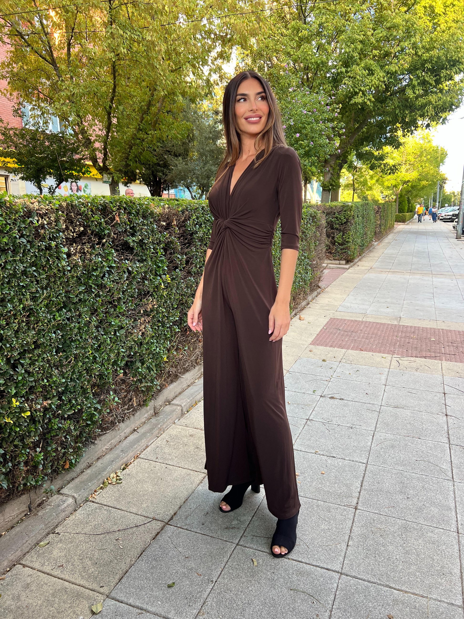 Este mono con escote pico y nudo debajo del pecho es una prenda de moda versátil y elegante.