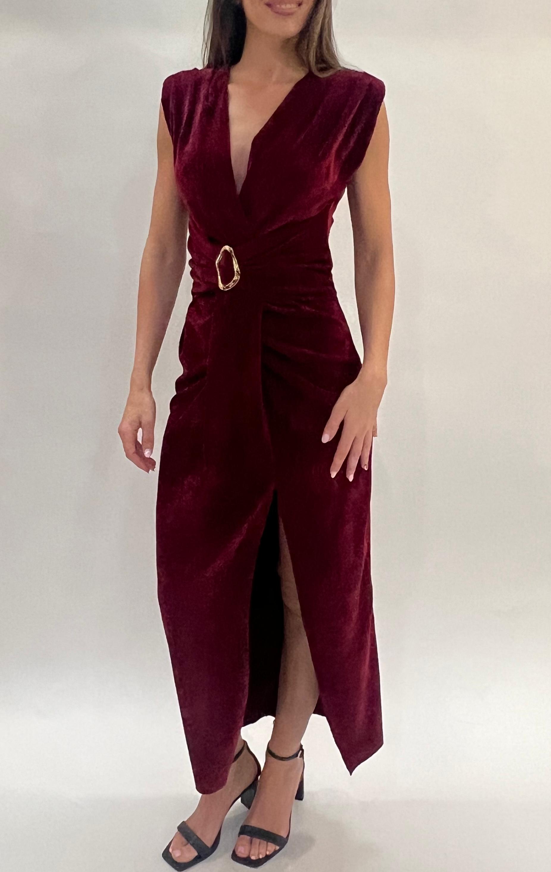 Este vestido largo en terciopelo granate es una pieza sofisticada y femenina, ideal para eventos y ocasiones especiales. Su tejido suave y ligeramente satinado aporta un acabado lujoso que realza la figura con un tacto agradable y elegante.